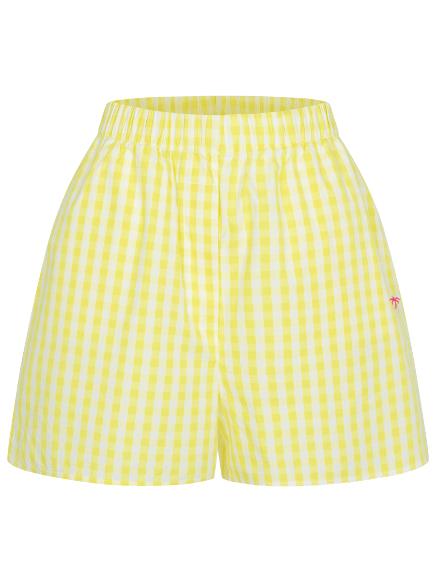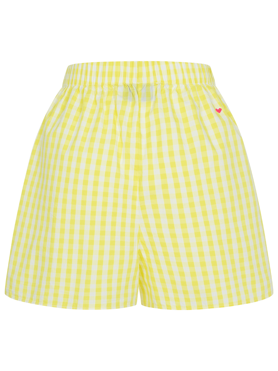 Luftige gelb karierte Shorts aus Baumwoll-Popeline mit kleiner Palmen und Herz Stickerei.