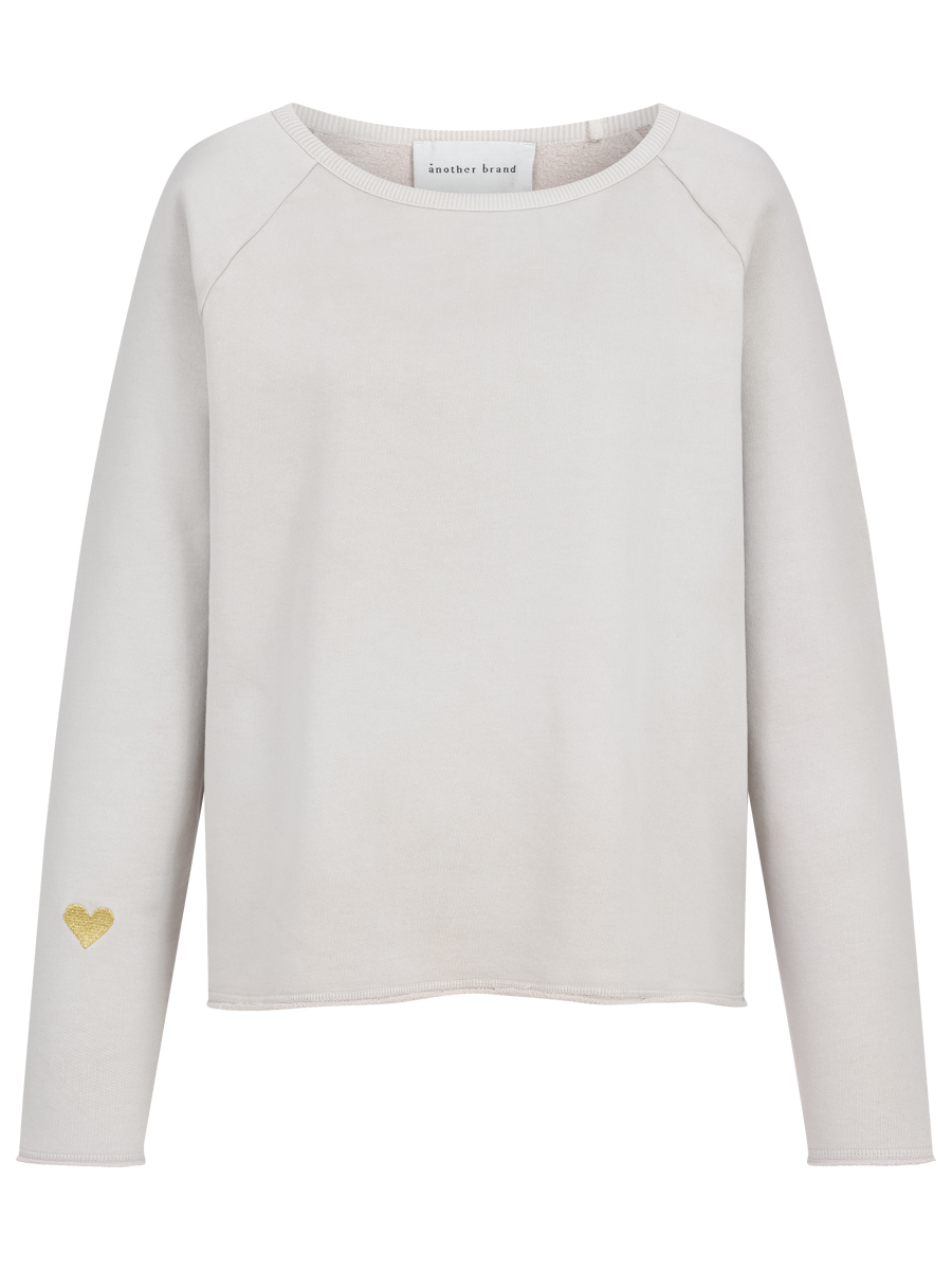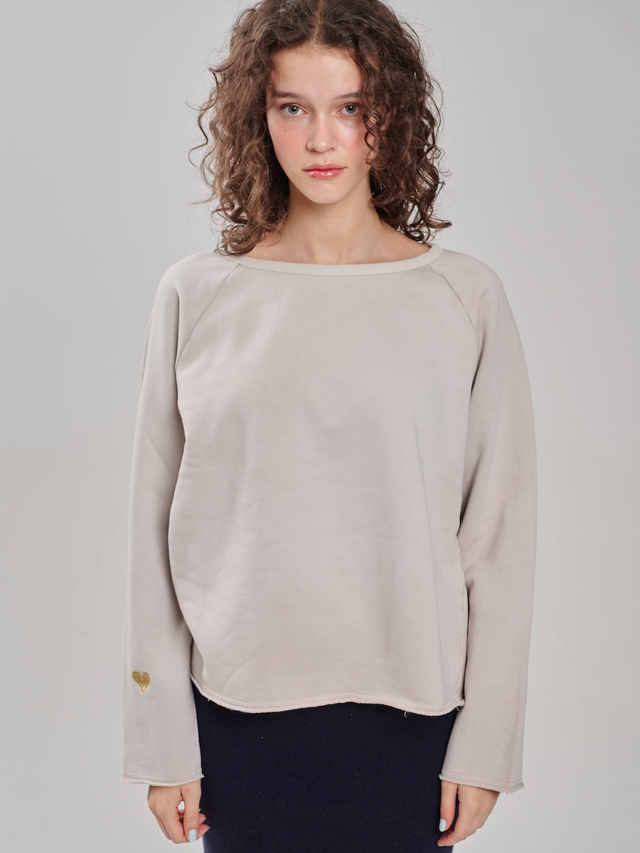 Dieses leicht ausgestellte Sweatshirt in modernem Steinton wurde in Portugal aus weichem Baumwoll-Jersey gefertigt. Offene Kanten an Saum und Ärmeln sorgen für eine entspannte Optik, während das kleine Herz-Detail auf dem Ärmel dem Modell eine besondere, liebevolle Note verleiht.