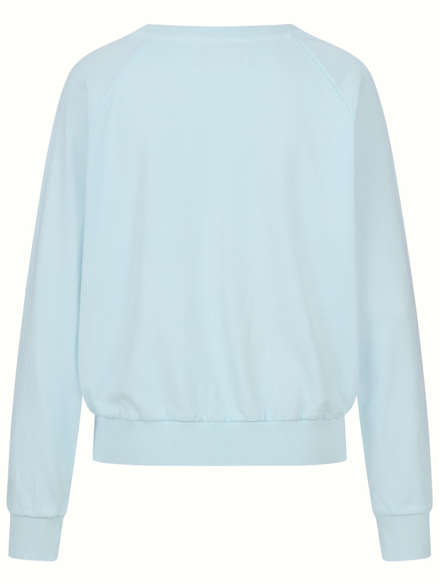Mit kleinen Palmen besticktes hellblaues Sweatshirt mit Raglanärmel aus weichem Baumwoll-Jersey, made in Portugal.